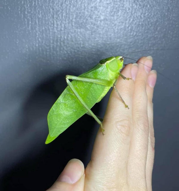 Katydid of all species can jump and are more jumpy when they are nymphs. They can fly if they need to but it is unlikely. I personally have only witnessed them fly once at they didn't get very far. The Katydids are more active at night,
